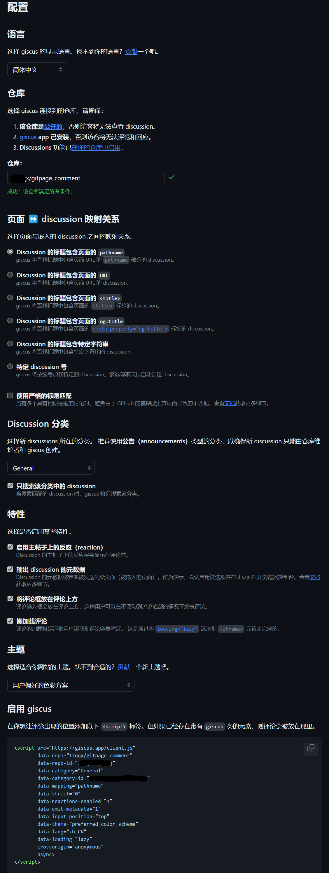 接下来在 giscus 的官网 配置模块选择所需配置: